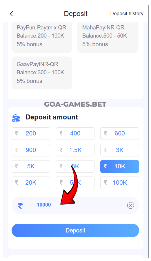 After selecting your deposit method, you’ll need to enter the amount of money you wish to deposit into your Goa Games account. Make sure to enter the desired amount accurately.