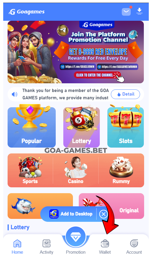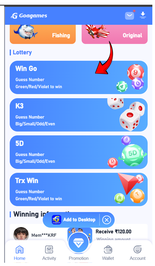Log in to your Goa Games account and navigate to the Promotion section of the platform. Located at the bottom center in a diamond shape icon.