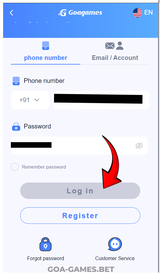 Enter Your Credentials: Enter the phone number and password associated with your Goa Games account in the provided fields.